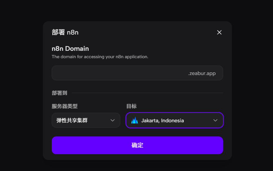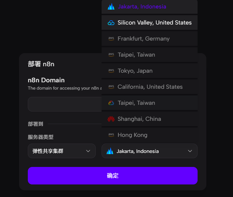 在部署过程中,可以自定义三级域名,选择部署在哪个区域的服务器,因为是免费白嫖,只能部署到美利坚和印度尼西亚,部署到两个区域,访问可能不太好,注意这点。