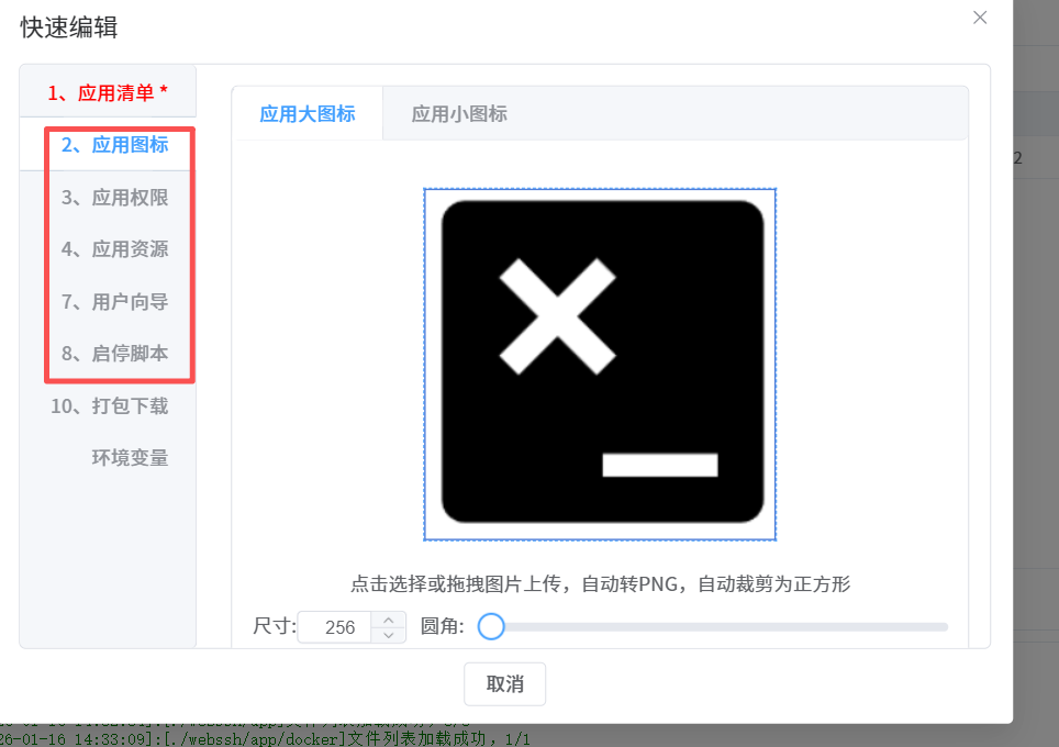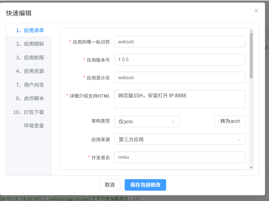 唯一标识符就默认即可,版本号根据需求改,应用显示名,就是这个安装完显示的名称,我这里就填webssh。