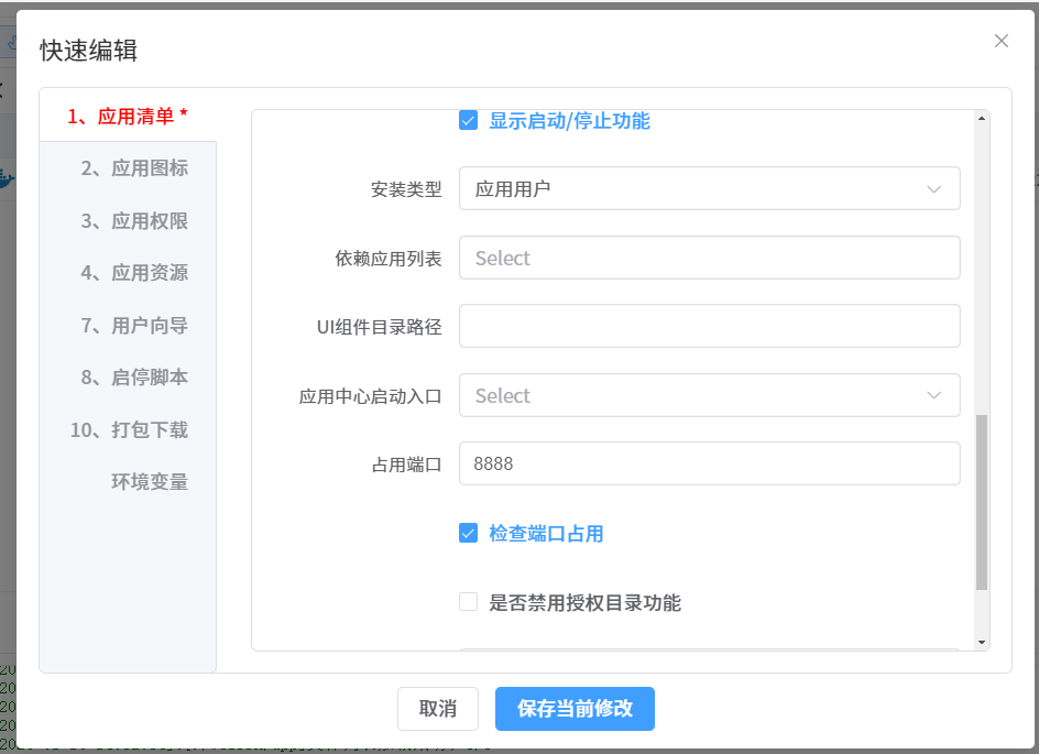占用端口根据docker-compose.yml文件里的填,安装类型选应用用户,记得勾选检查端口占用,最后保存当前修改