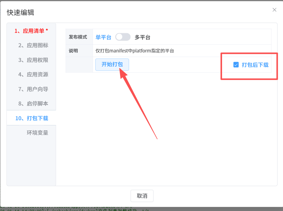 勾选打包后下载,就点击开始打包